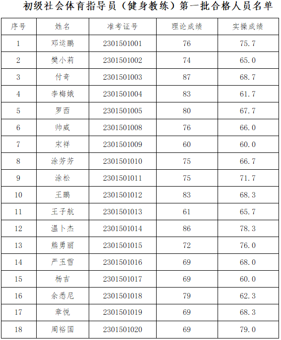 根據《江西省人力資源和社會保障廳關于公布江西省第二批職業技能等級認定社會培訓評價組織的通知》(贛人社字〔2022〕128號)文件精神,以社會體育指導員《國家職業資格》作為評價標準,2023年5月6日組織開展初級社會體育指導員(健身教練)認定工作,理論、實操考試應考20人,實考18人,其中18人兩項成績均達60分(含)以上。